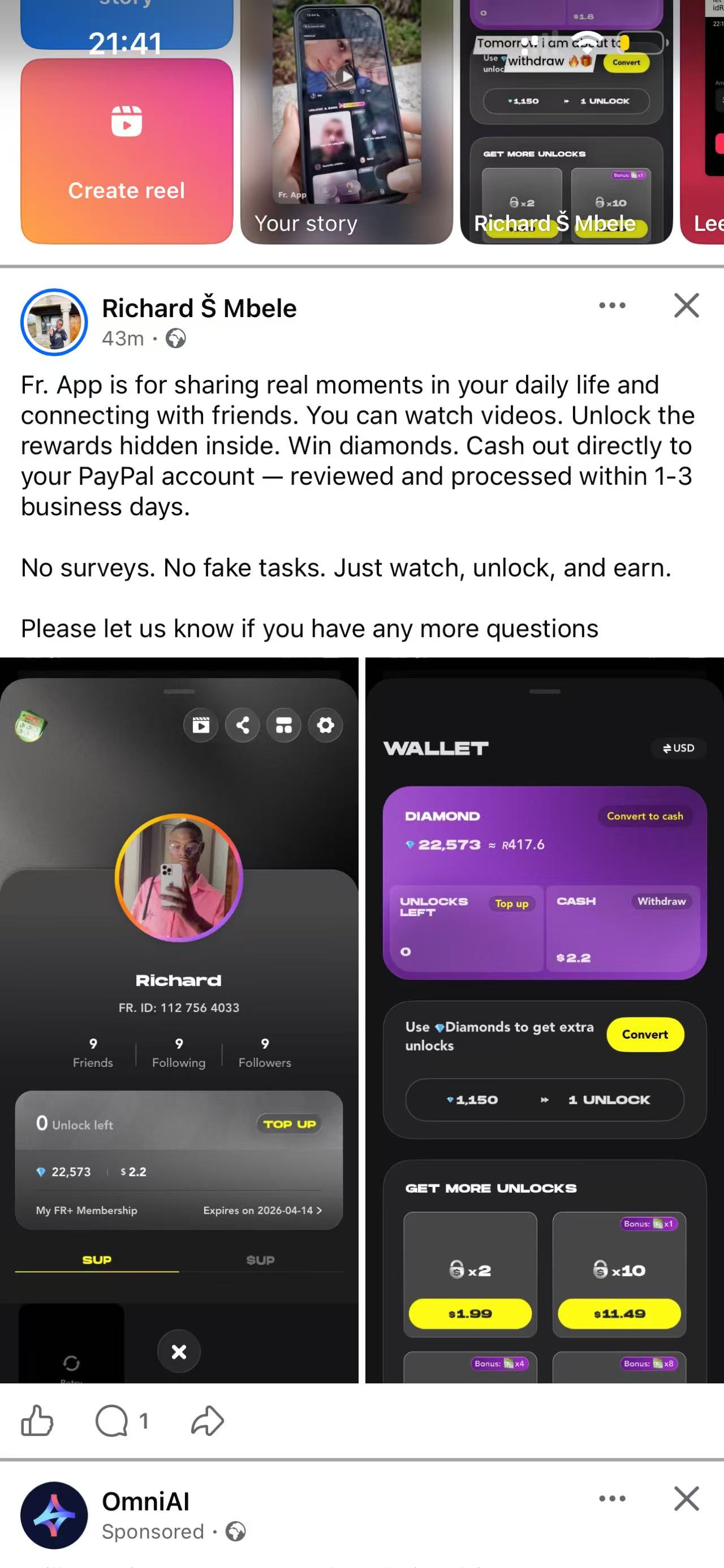 InstagramUnlock content, collect diamonds, cash out 💸 Fr. App really pays out. My PayPal keeps getting notifications lol